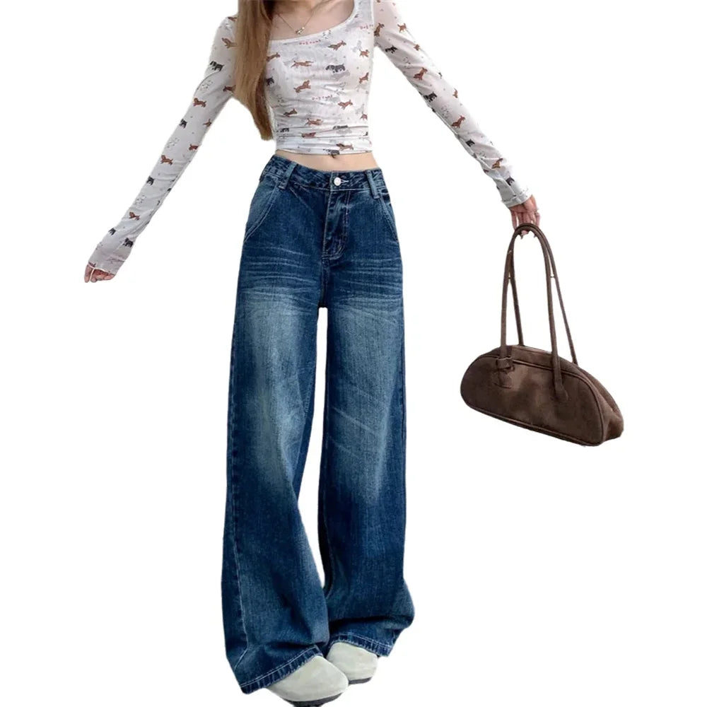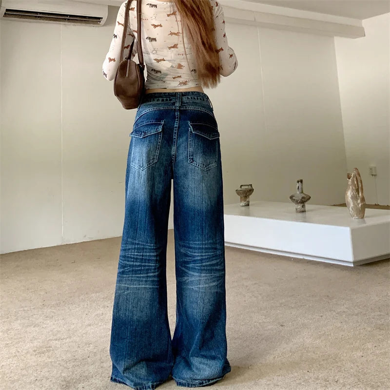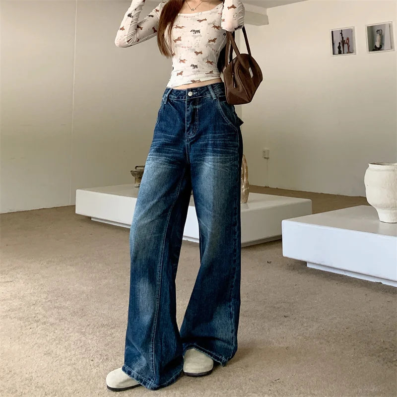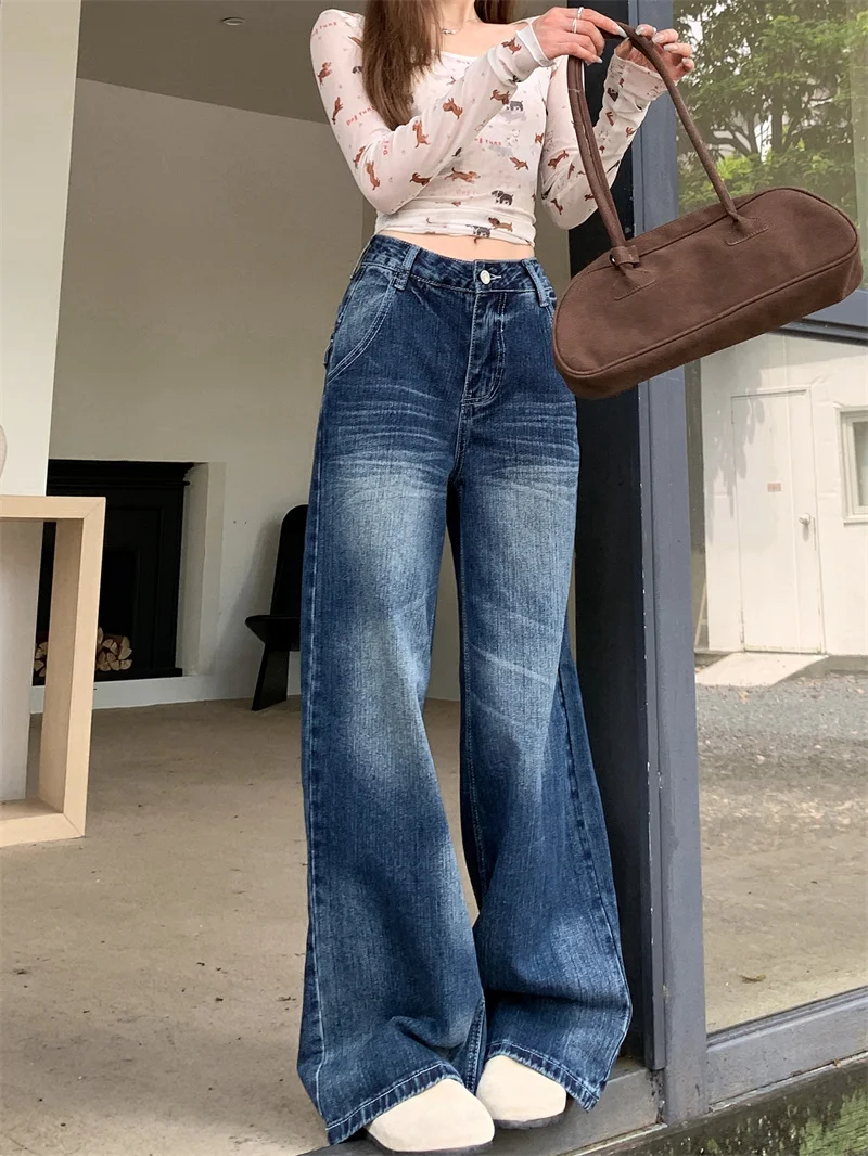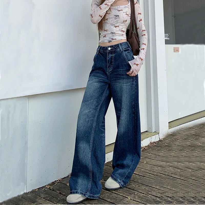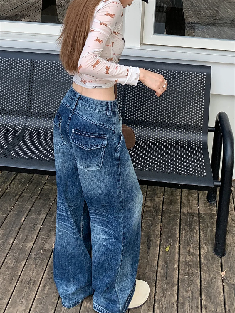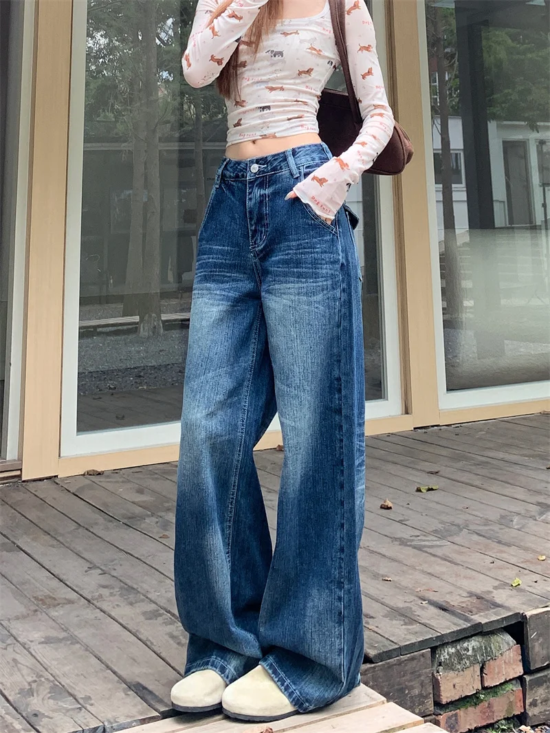 2025 Autumn Women's Y2K Jeans Dongdaemun Navy Back Whisker Jeans Loose Straight Leg Casual Denim Pants 2742