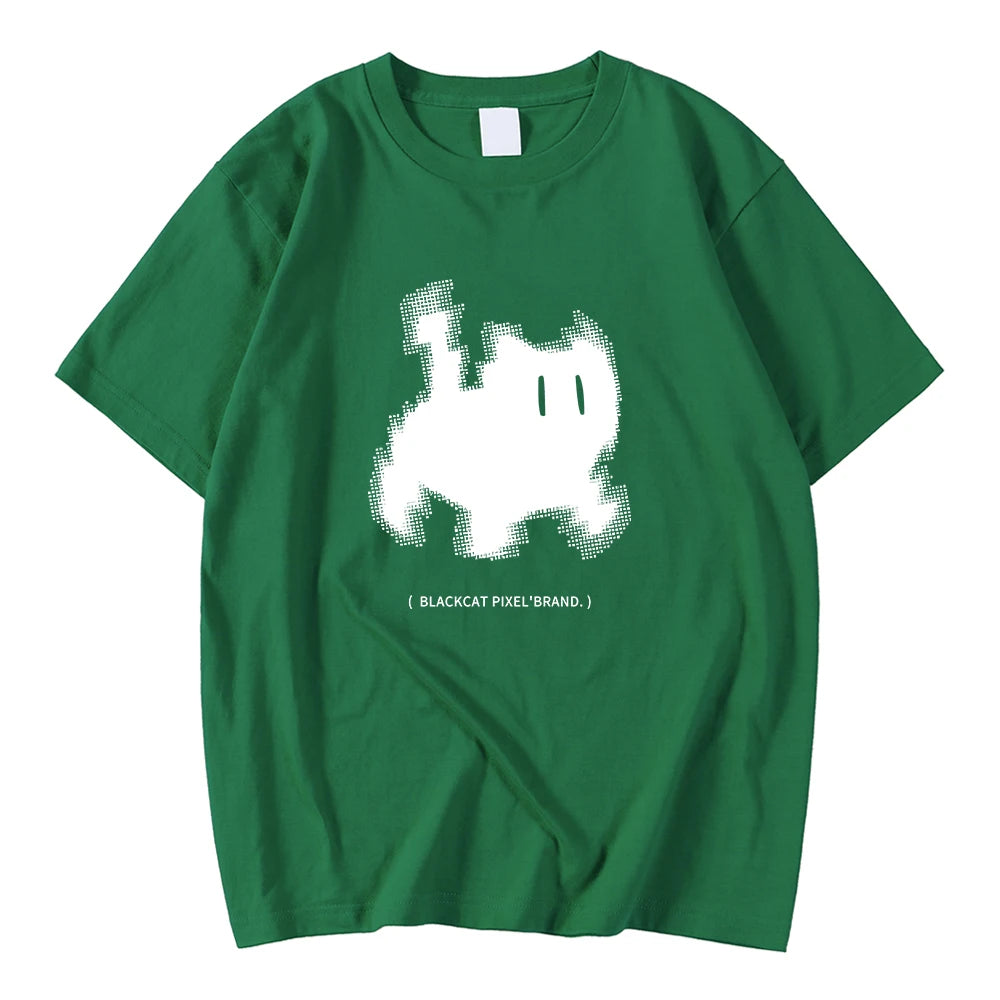 Korean Fashion Womens T-Shirts Black Cat Pixel Cartoons Printing Tops Comfortable Soft O-Neck Loose Short Sleeve Female Clothes