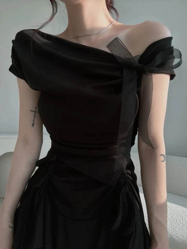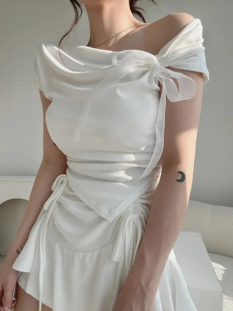 Korean Style 2026 Summer Temperament Sweet Tees Women Sexy Bow Lace Up Crop Top Irregular Off Shoulder Short Sleeve T-shirts