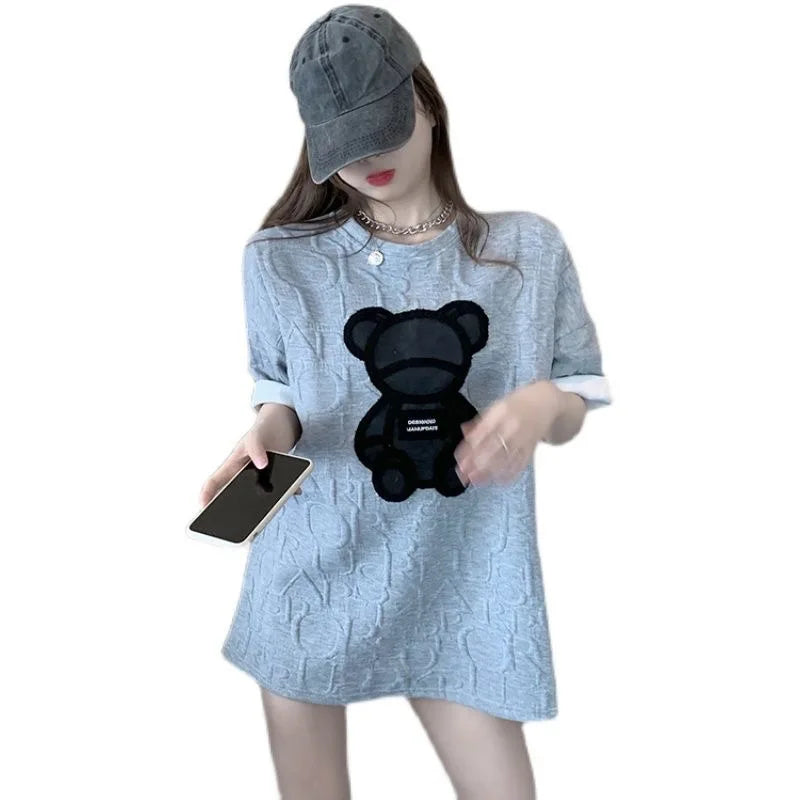 Summer Cotton Short Sleeve T Shirts Women Casual Cartoon Bear Loose T-shirt O-neck Basic Crop Tops High Streetwear Fashion Tees