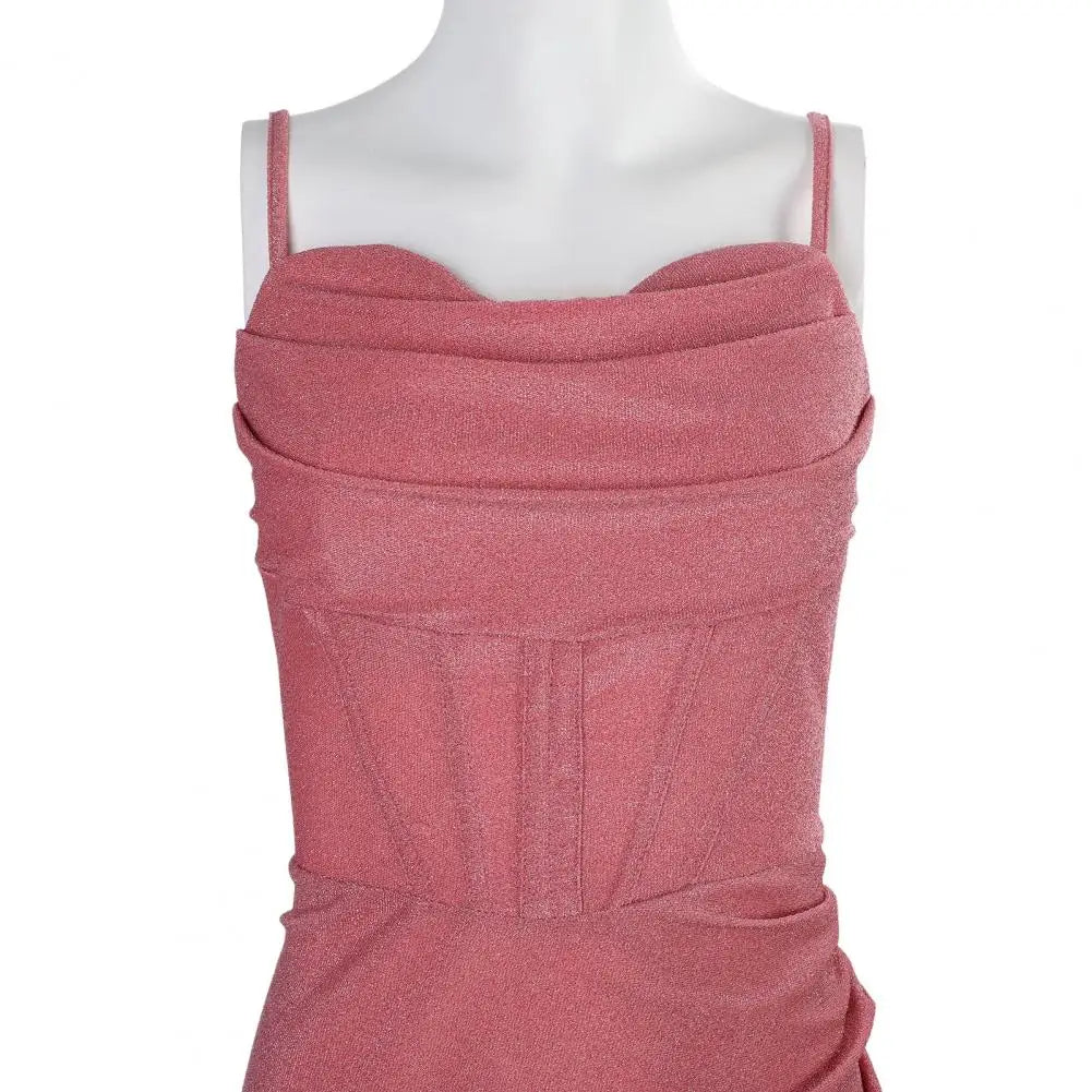 The slim-fitting design with thigh slits and a fishbone waist detail adds an elegant and sexy charm to the dress.