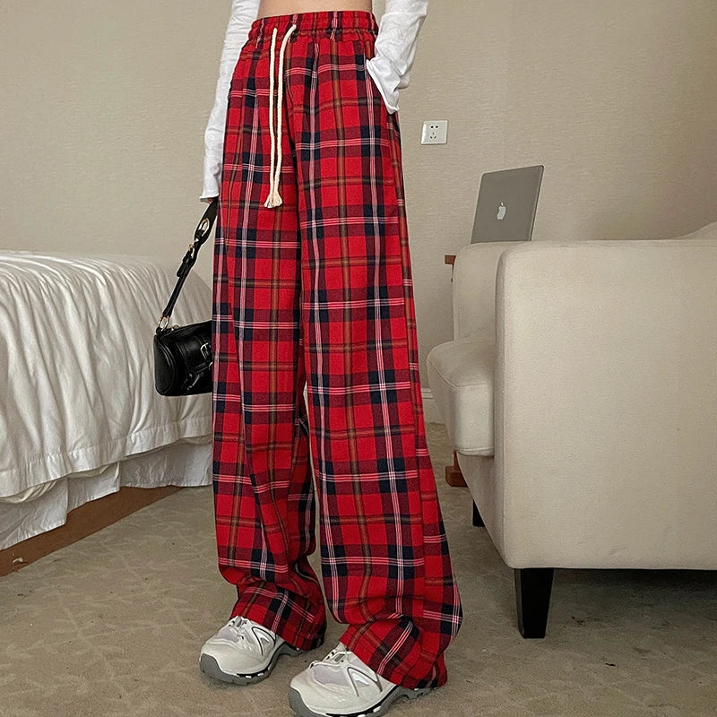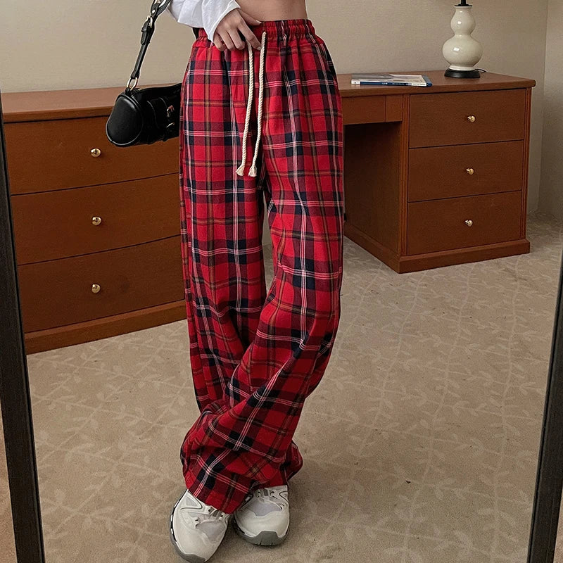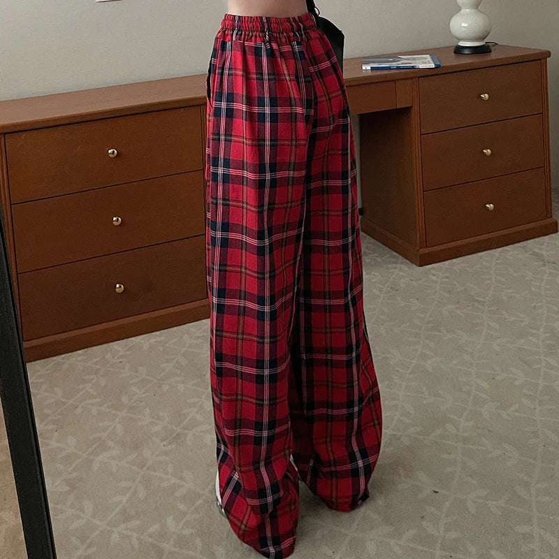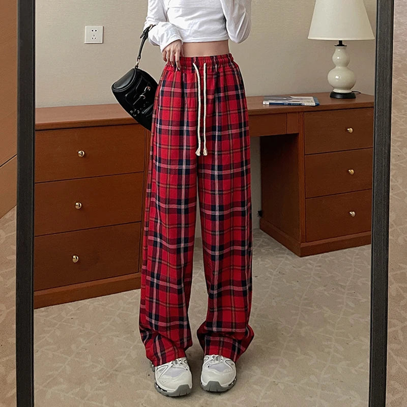 Women High Waist Y2k Loose Straight Leg Pants Lady Korean Harajuku Baggy Wide Leg Trousers Female Casual Grunge Red Plaid Slacks